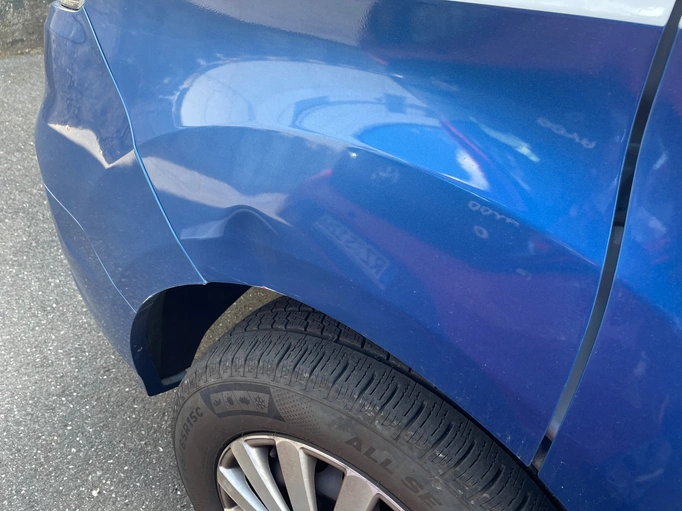 Liten buckla på vänster stänkskärm (parkeringsbula)
